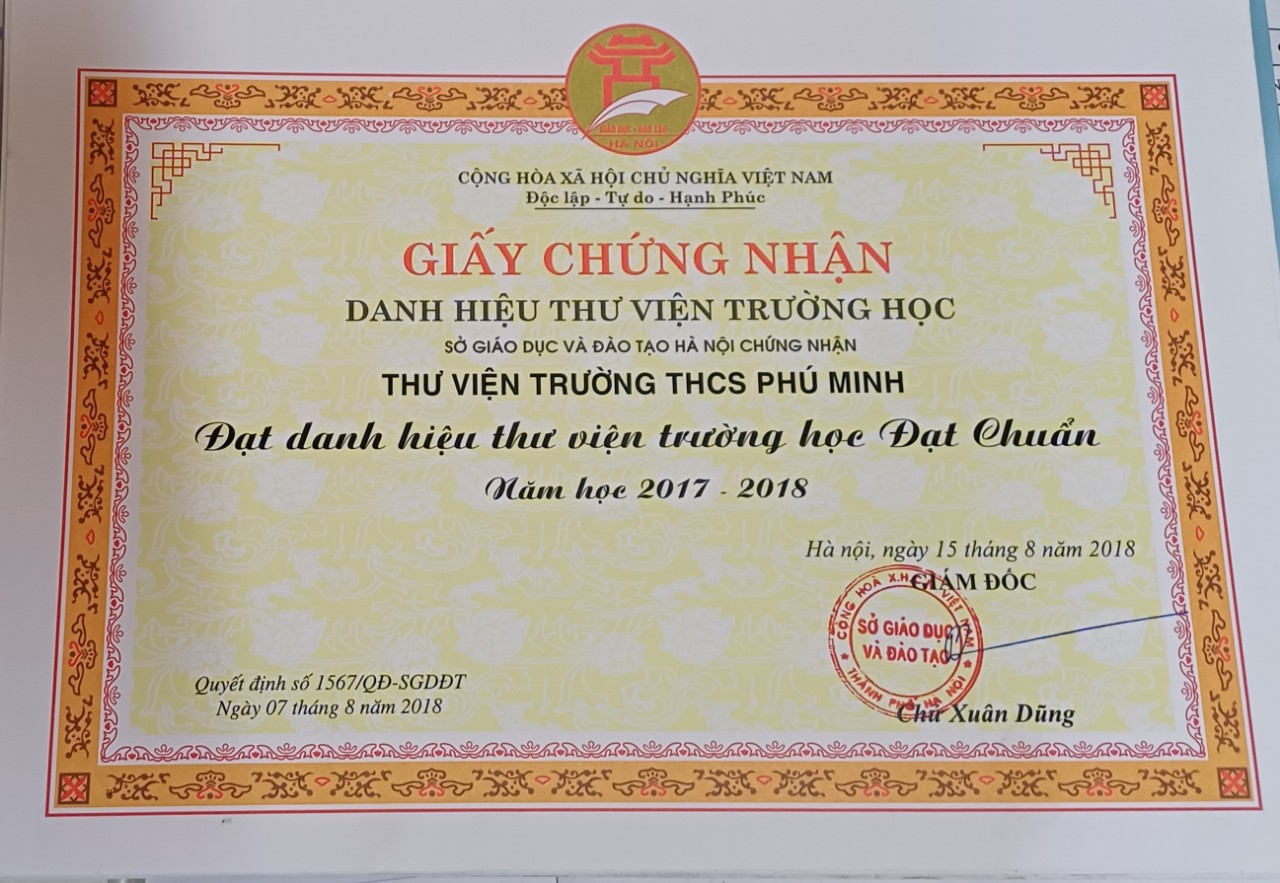 Giấy chứng nhận thư viện đạt chuẩn năm học 2017 - 2018
