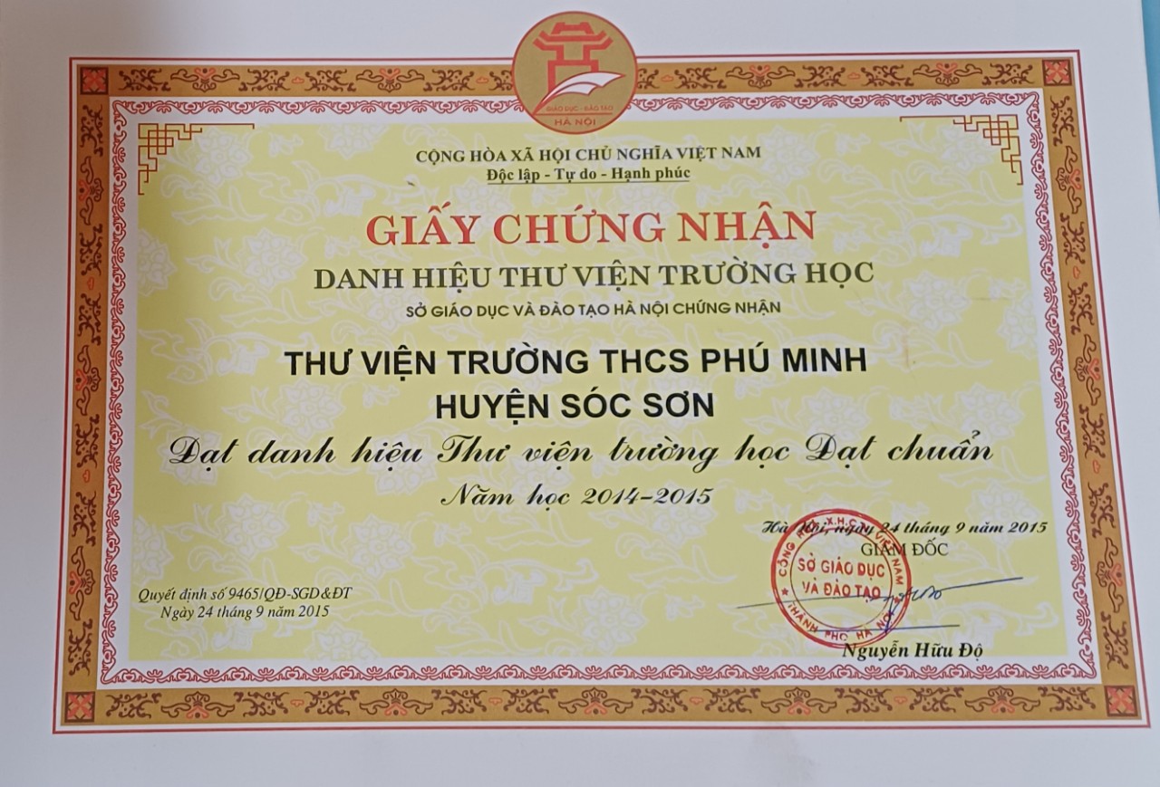 Giấy chứng nhận thư viện đạt chuẩn năm học 2014 - 2015